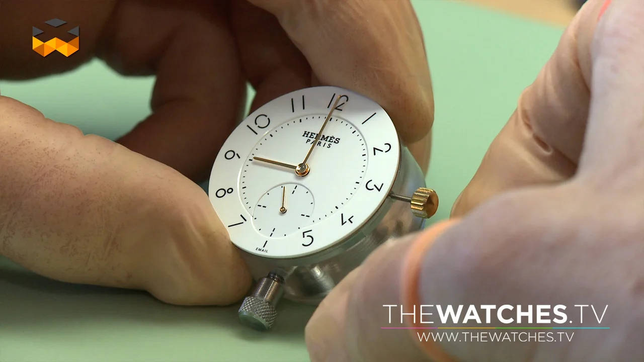 This contre email (counter enameling) helps to balance forces every step of the way and serves to maintain it during the whole life of the dial. Depending on the final thickness of the dial, up to 6 layers of powder are added. The final goal is to have the most immaculate white color possible. Before every new cycle, the dial is also cleaned with a metallic tool to remove cracks. Then the dial is ready to receive further elements as requested by our client. Using the pad printing technique, we transfer colored enamel from a cliché onto the dial, which is domed. Once this has been accomplished, the dial heads to the kiln one final time, which brings the whole dial back to a fusion state that is immediately evened out by pressing on the surface with a bar of coal. If a crack appears at this point that can’t be removed, the dial is considered defective and thrown out. This operation causes about 40% rejects. On the exterior of the dial the enamel is not flat but domed. This must be eliminated to have a perfectly flat dial — like the one for the Hermès watch, for instance. We eliminate about one centimeter’s worth of material from the diameter. The Hermès dial is made out of three separate parts that must be assembled to create the final dial. We manufacture each of them independently before gathering them into a set. It takes 80% manual operations to create the appropriate angles that will ensure a perfect match of all the parts together. They are then welded together using tin. Its a fragile dial that once encased lasts forever. The white color will remain unchanged. The color of lacquered dials will imperceptibly change throughout time. A dial made out of enamel is like gold: timeless."