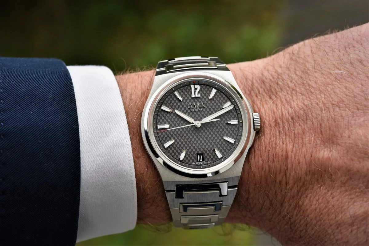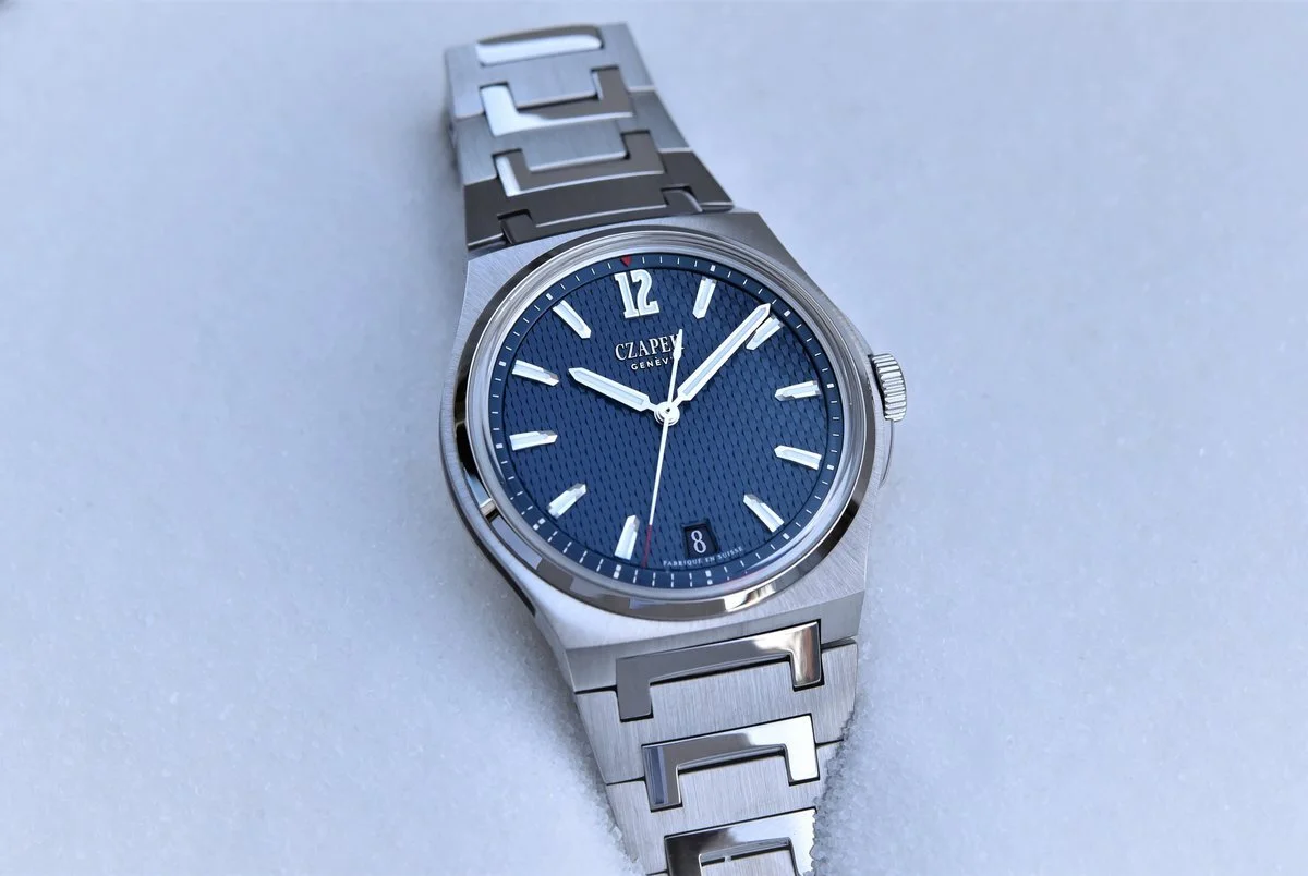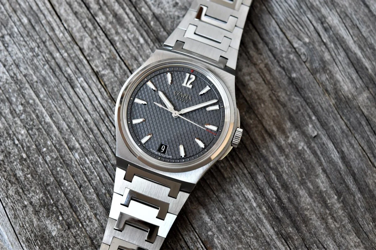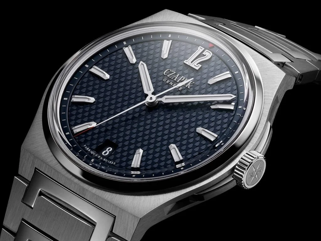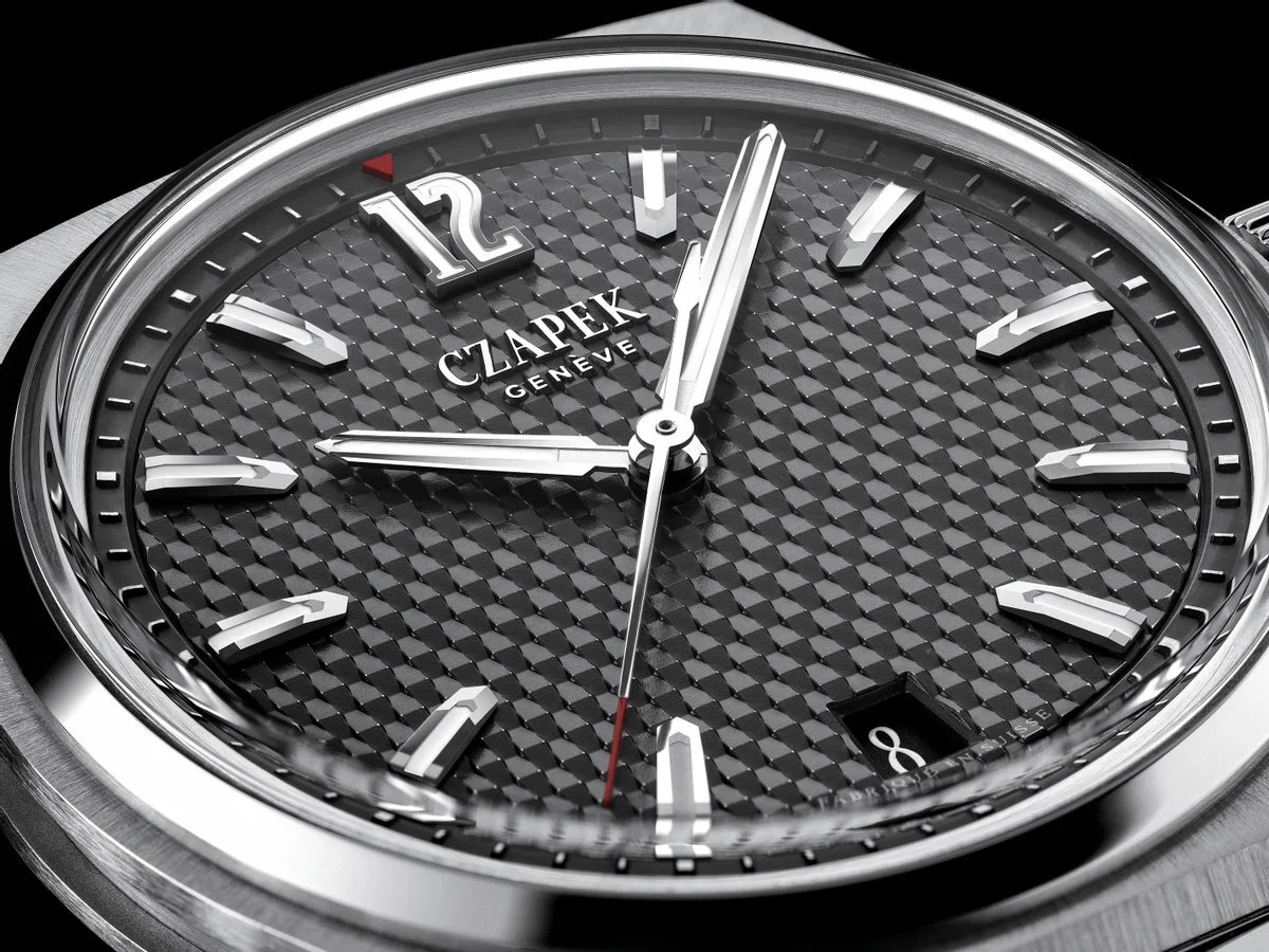 A quick-change system allows each owner quickly switch the bracelet to a rubber or a leather strap, decorated with the same trapezoid pattern as the dial.