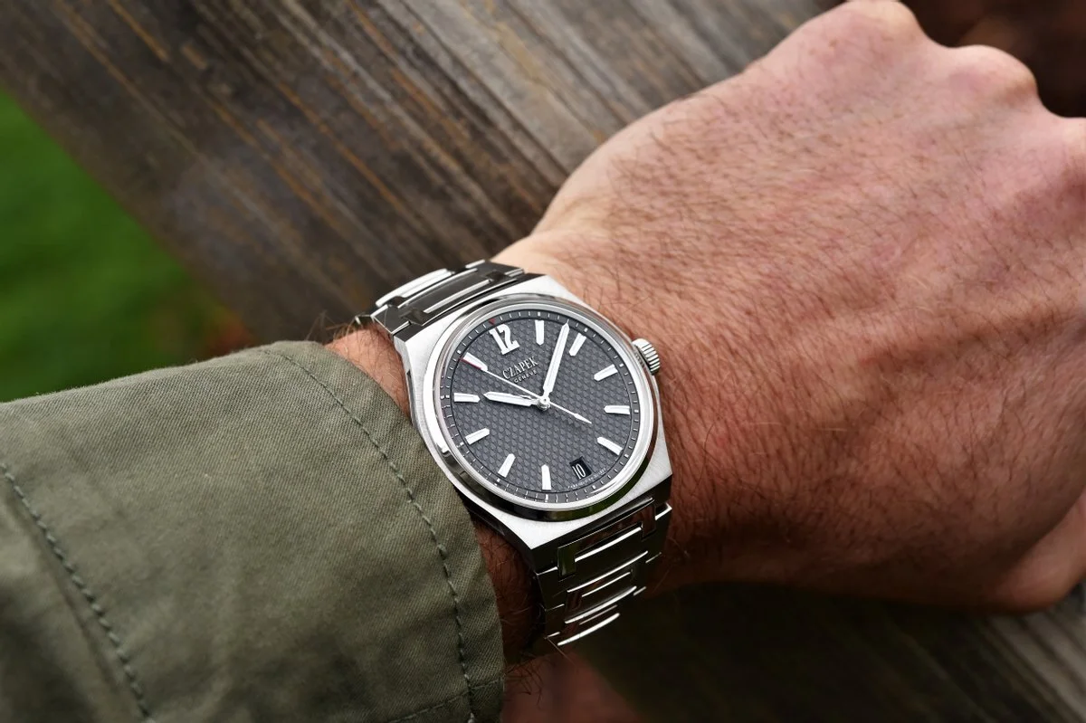 Classy and elegant 40.5mm and 10,6mm height stainless steel case is adapted to an integrated bracelet, made of brushed and stainless steel as well, which perfectly follows the shape of the case. Sapphire crystal case-back with anti-reflective treatment and the water-resistance of 120 metres makes it a perfect sport watch.