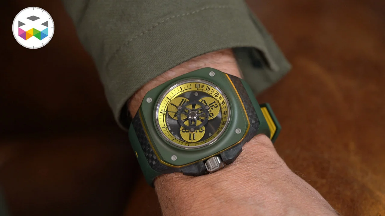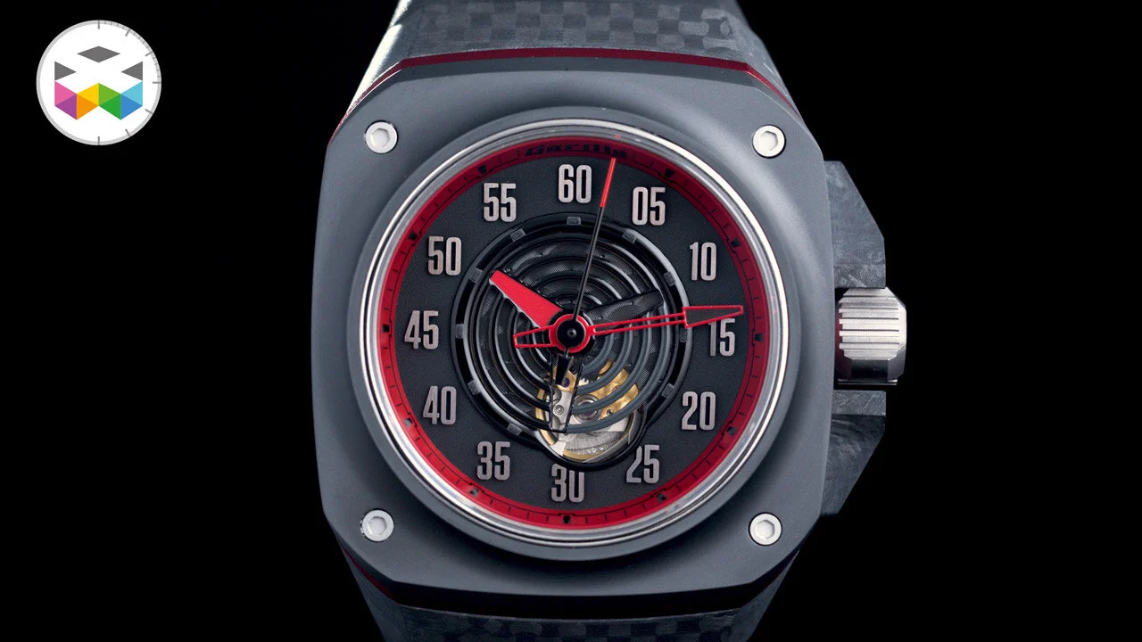 The case is made out of forged carbon with an inlay of anodised aluminium and a ceramic bezel, so quite a qualitative proposition by the brand founded by Octavio Garcia and Lukas Good in 2016, both being watch designers per trade and this can felt in some of the details you will see on this watch.
