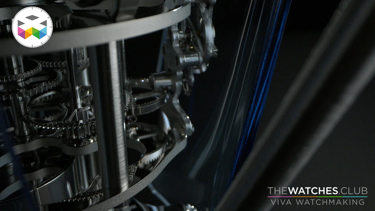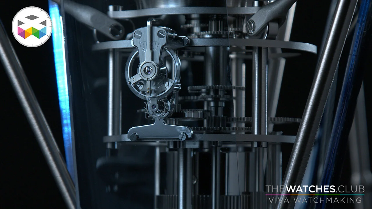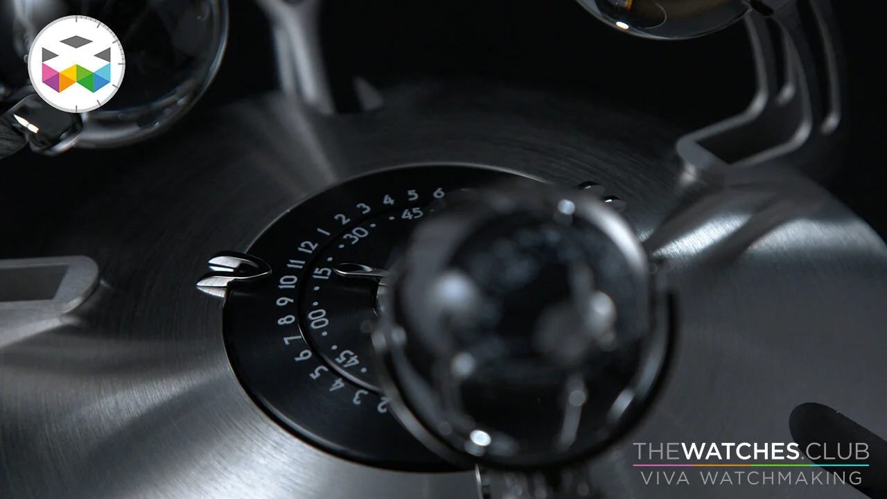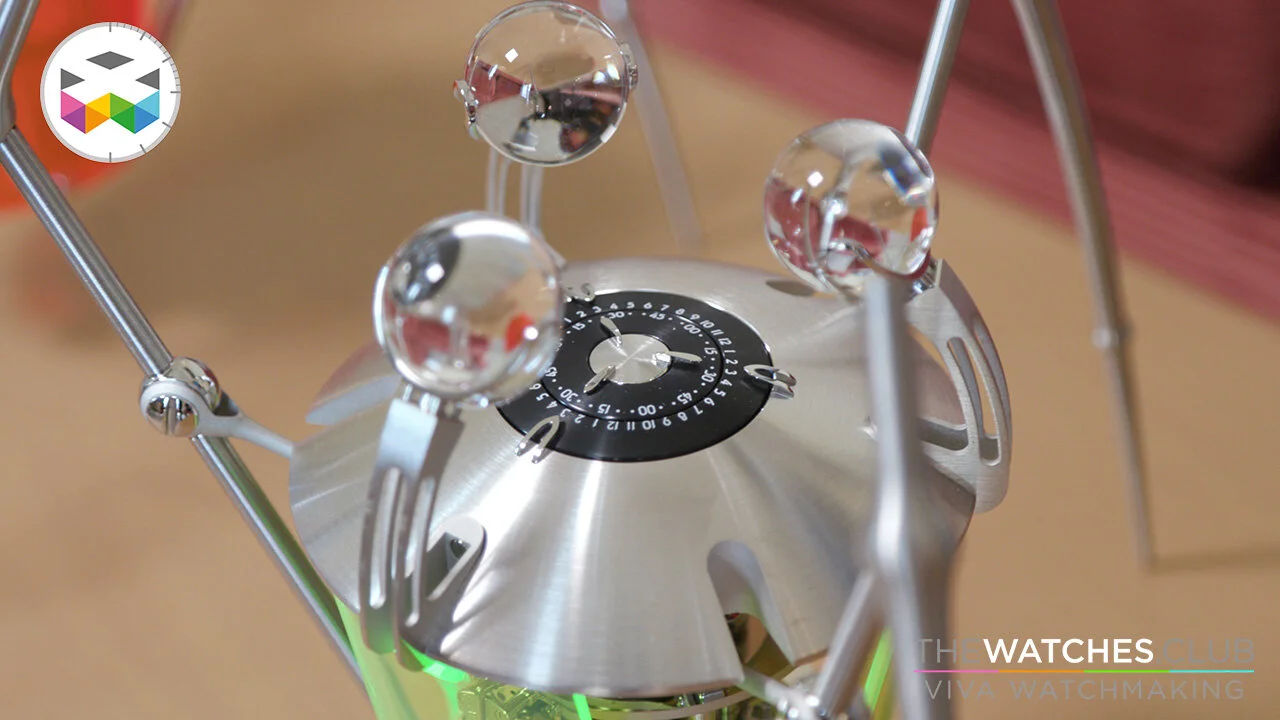 Time is displayed on two horizontal concentric dials turning on themselves in 36 hours, but the most intriguing feature lies on the fact that you actually read the time by looking through three glass balls.